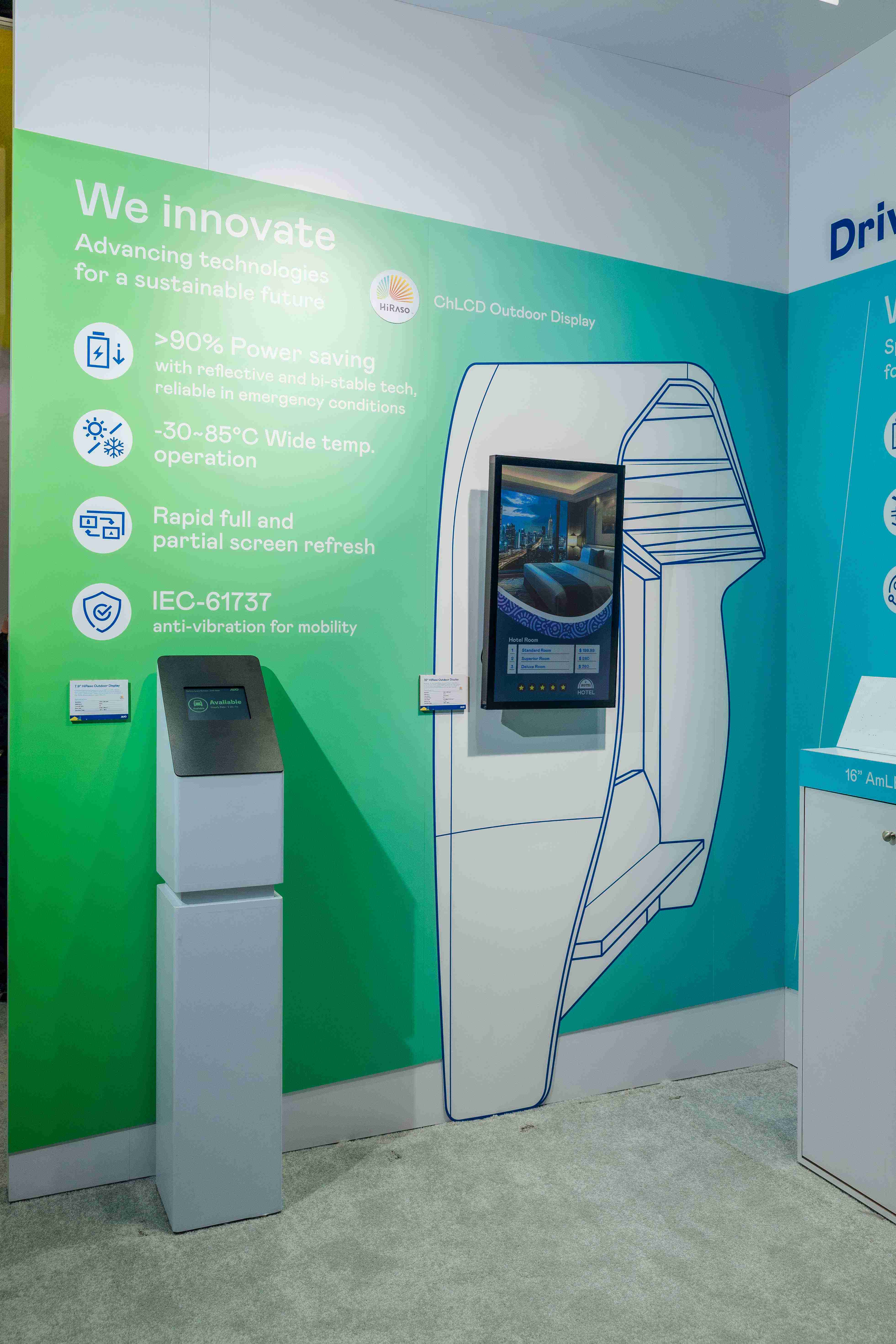 HiRaso胆固醇液晶显示器运用反射环境光线的方式,,呈现影像显示时零耗能的环保省电诉求,,,光线愈强愈能呈现绝佳的色彩饱和度及显示效果,,同时在摄氏-30度至85度间宽温的使用优势,,,为户外电子看板的新首选。。。。