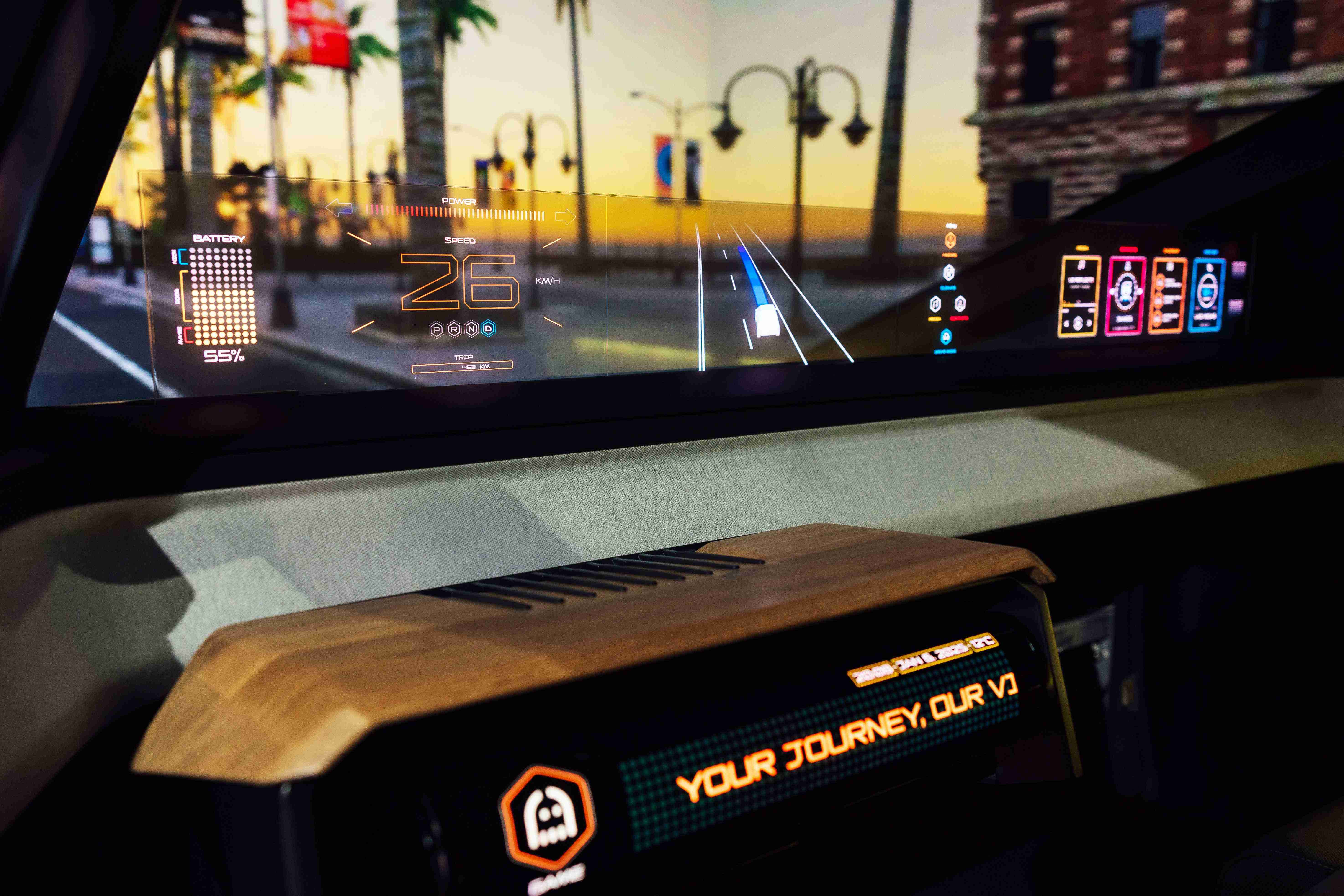 车用运算方案驱动无界透明显示介面(Horizon Image Glass),,整合仪表板、、、中控及副驾显示功能为一体式全景呈现,,不仅提供清晰的外部视野,,亦能即时显示车辆状态、、、导航及路况资讯,,,并赋予个性化设定与驾驶安全警示等加值化服务。。。